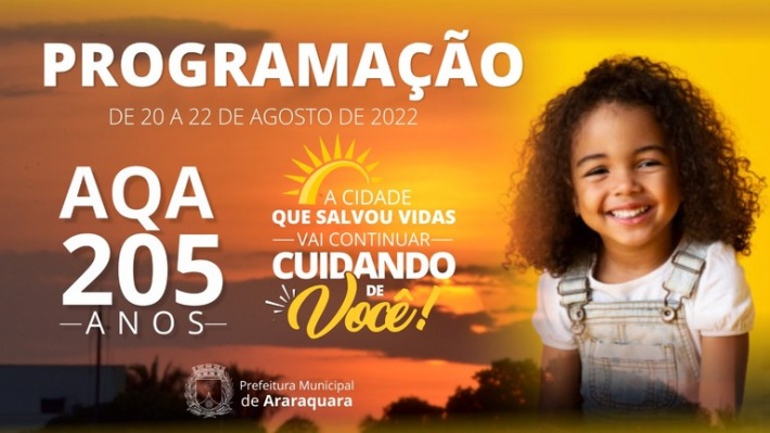 Os 205 anos de Araraquara estão chegando e a Prefeitura de Araraquara organiza uma festa para todas as famílias, com uma programação que irá contemplar crianças, jovens e adultos. A programação solidária e gratuita será realizada nos dias 20, 21 e 22 de agosto (sábado, domingo e segunda-feira) com desfiles, shows musicais, feiras, missa e seresta. O cantor Jão é quem comanda a última atração da agenda, no dia 22, com show solidário noturno no CEAR – Centro de Eventos de Araraquara e Região (ingresso: 1 kg de alimento ou ração para cães e gatos).