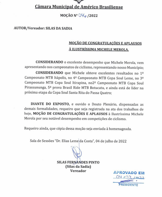 Considerando o excelente desempenho que Michele Merola vem apresentando em campeonatos de ciclismo, elevando o nome do município de Américo Brasiliense, através do vereador Silas da Sadia, a Câmara Municipal de Vereadores emitiu uma Moção de Congratulações e Aplausos.