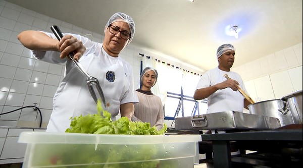 Os funcionários servem 800 refeições por dia. Tudo é preparado por uma equipe que não descansa nem nas férias da garotada.