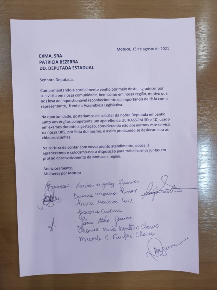 Na última sexta-feira, dia 13, Fábio Chaves esteve em Américo Brasiliense, em reunião com a Deputada Estadual Patrícia Bezerra, onde entregou para a parlamentar um ofício solicitado pelo ‘Grupo Mulheres por Motuca’, pedindo uma verba parlamentar para compra de um Aparelho de Ultrasom 3D e 4D para ajudar às gestantes que devido falta do equipamento em seu município, têm que viajarem para outras cidades para fazerem esse tipo de exame. Chaves intermediou também a ida de Patrícia Bezerra para conhecer Motuca.