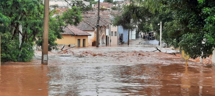A via e outras que ficam na região foram tomadas pela água e lama. No centro da cidade, funcionários de uma pizzaria tentaram chegar até o local, que ficou alagado, usando uma boia, mas acabaram desistindo.