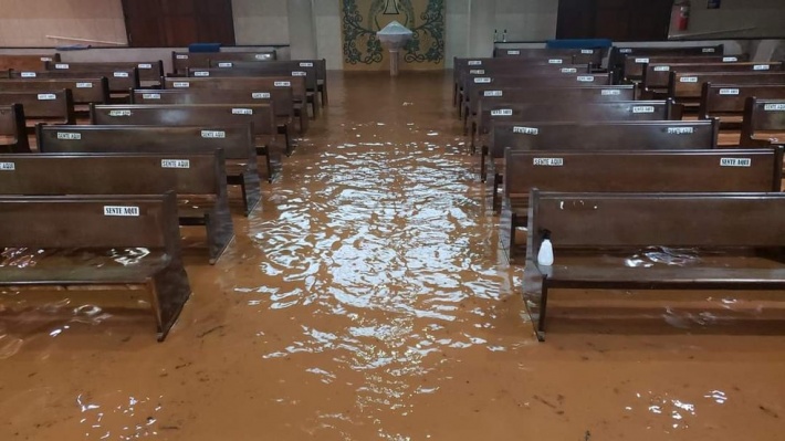 Água invadiu uma igreja, que ficou alagada em Jaú — Foto: Arquivo pessoal