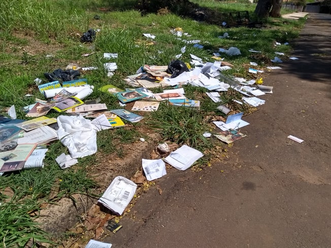 Restos de papeis e documentos datados com o nome de um possível candidato ao cargo de prefeito para as eleições 2020, foram jogados na rua e no mato.