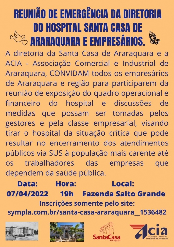 A diretoria da Santa Casa de Araraquara e a ACIA - Associação Comercial e Industrial de Araraquara, CONVIDAM todos os empresários de Araraquara e região para participarem da reunião de exposição do quadro operacional e financeiro do hospital e discussões de medidas que possam ser tomadas pelos gestores e pela classe empresarial, visando tirar o hospital da situação crítica que pode resultar no encerramento dos atendimentos públicos via SUS à população mais carente até os trabalhadores das empresas que dependem da saúde pública.