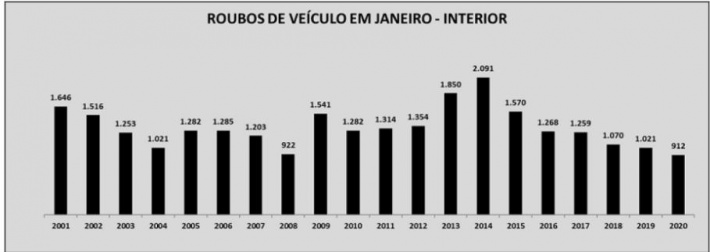 O interior do Estado de São Paulo terminou o primeiro mês do ano com reduções na maioria dos indicadores criminais. Houve queda nos casos e vítimas de homicídios dolosos, em todas as modalidades de furtos e nos roubos em geral, de veículo e de carga. Os roubos a banco e extorsões mediante sequestro permaneceram estáveis sem ocorrências registradas.