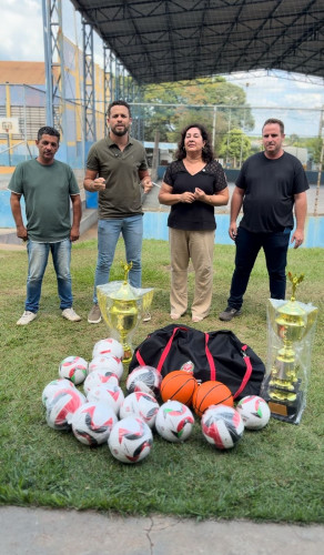 o vereador Jhon Braga anunciou, ao lado da prefeita Terezinha Viveiros, do vice-prefeito Leandro Mancha e do diretor de esportes Mário Campos, a chegada de novos materiais esportivos.