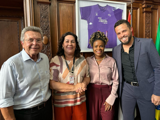 Jhon Braga ao lado da prefeita Terezinha Viveiros, do vice-prefeito Leandro Mancha e do diretor de esportes Mário Campos