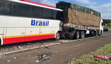 Ônibus com passageiros bateu na traseira de caminhão carregado com telhas, na Rodovia Cândido Portinari. Uma das 12 vítimas teve ferimentos graves, segundo a PM.
