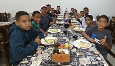 Crianças do projeto esportivo do grupo Destaquemil participaram de uma noite de pizza gratuitas na Pizzaria Veneza em Américo.