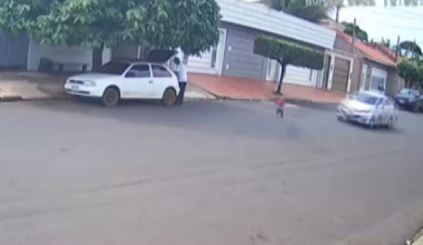 Câmeras de segurança registraram o momento em que menino de 1 ano e meio foi atingido por lateral do carro que passava na rua.
