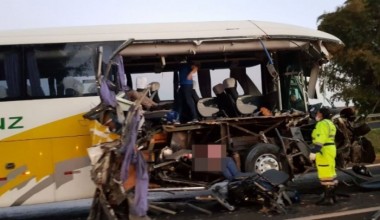 Mulher morre após acidente entre ônibus e caminhão
